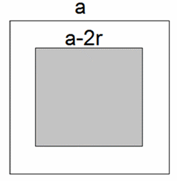 Задача имеет смысл, если выполнено условие 2r < a. Отступим с каждой стороны квадрата внутрь на радиус монеты r и нарисуем меньший квадрат со стороной a - 2r. Если центр монеты попадает в маленький квадрат, то монета не пересечет ни одну из сторон большого квадрата. Если же центр монеты попадет за пределы маленького квадрата, монета обязательно пересечет хотя бы одну из сторон большого квадрата. Отсюда следует, что вероятность того, что монета не пересечет ни одну из линий, которыми расчерчен пол, есть отношение площади малого квадрата к площади большого квадрата: