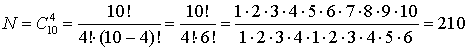 . Пример 7.2В группе — 25 студентов. Наугад выбирают 4-х. Если они все вместе весят меньше 240 кг, всей группе ставится зачет по физкультуре, в противном случае вся группа бежит пятикилометровый кросс. Какое количество вариантов выбора есть у преподавателя физкультуры?Решение. Из 25 человек выбирается 4. При этом очевидно, что важен только состав, поскольку суммарный вес выбранных студентов не зависит от порядка их выбора. Следовательно, можно применить формулу для сочетаний: