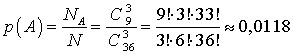 , где N — общее число элементарных событий, NA — число элементарных событий, благоприятствующих наступлению события А. Общее число элементарных событий есть количество вариантов выбора 3-х различных карт их 36 карт. Оно может быть вычислено по формуле