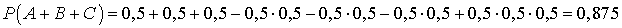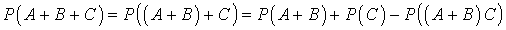 .Пример 17.2Вероятность поразить мишень при одном выстреле равна 0,5. Какова вероятность поразить мишень с трех выстрелов?Пусть событие A заключается в том, что мишень поражена первым выстрелом, событие B — вторым, и событие C — третьим (как и в предыдущей задаче поражение мишени последующим выстрелом не исключает возможности ее поражения и каким-нибудь предыдущим или обоими предыдущими выстрелами). Исходя из обычных условий стрельбы, можно считать, что все указанные события — независимы. Запишем вероятность суммы событий, используя теорему о вероятности суммы совместных событий, при этом разбив сумму трех событийa, b иC на сумму двух событийA +B иC: