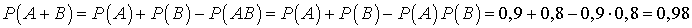 . Пример 17.3На экзамен пришли 2 студента. Вероятность того, что первый студент сдаст экзамен, составляет 0,9. Вероятность того, что второй студент сдаст экзамен — 0,8. Какова вероятность того, что хотя бы один из них экзамен сдаст?Пусть событие A заключается в том, что первый студент сдаст экзамен, а событие B — второй студент сдаст экзамен. В задаче требуется найти вероятность суммы событий A + B, причем эти события совместны, так как возможна ситуация, когда оба студента сдадут экзамен. Используя формулу для вероятности суммы совместных событий и предполагая независимость этих событий (что вполне естественно), имеем: