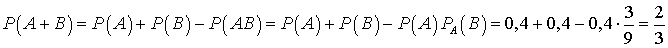 . Пример 17.4В ящике 4 красных и 6 синих шаров. Вытаскивают два шара. Какова вероятность, что хотя бы один из вытащенных шаров окажется красным?Пусть событие A заключается в том, что первый из вытащенных шаров красный, а событие B — второй из вытащенных шаров красный. В задаче требуется посчитать вероятность суммы событий A + B, причем эти события совместны, так как возможна ситуация, что оба шара окажутся красными. Причем эти события, в отличие от предыдущих задач, нельзя считать независимыми, поскольку результат вытаскивания первого шара влияет на вытаскивание второго шара. Используя формулу для вероятности суммы совместных событий и формулу для вероятности произведения зависимых событий, имеем: