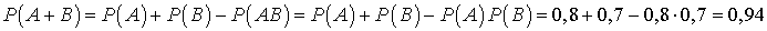 . Пример 17.5Имеются два независимых устройства, сигнализирующих об аварии. Вероятность срабатывания первого устройства составляет 0,8, вероятность срабатывания второго устройства — 0,7. Найти вероятность того, что сигнал об аварии будет подан.Пусть событие A заключается в том, что при аварии сработало первое устройство, а событие B — второе. В задаче требуется вычислить вероятность суммы двух событий A + B (то есть срабатывание хотя бы одного из устройств). Эти события совместны и независимы. Используя формулу для вероятности суммы совместных событий и теорему умножения для независимых событий, имеем: