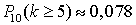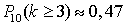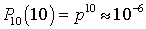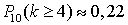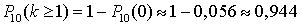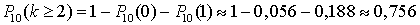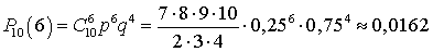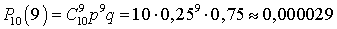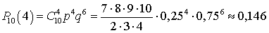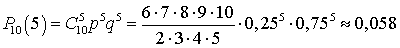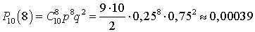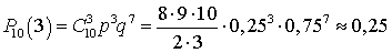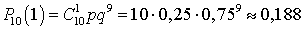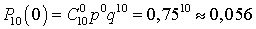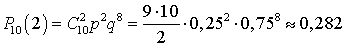 .Пример 20.2Тест состоит из 10-ти вопросов, по 4 варианта ответа на каждый вопрос. Один ответ верный, остальные — нет. Какова вероятность случайно ответить верно не менее чем на 1 вопрос, 2 вопроса, 3, 4, 5 ...?Вероятность удачи (верного ответа) — p = 0,25, вероятность неудачи — q = 0,75. По формуле Бернулли вычислим вероятности правильного ответа ровно на 1 вопрос, ровно на 2 вопроса и т.д.