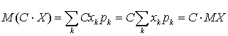 есть случайная величина, в которой значения случайной величины X умножаются на константу C, а соответствующие вероятности остаются неизменными. Тогда в формуле для математического ожидания все значения случайной величины будут содержать множитель C, который можно вынести за скобку и получить сформулированное утверждение: