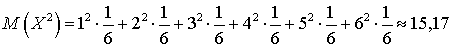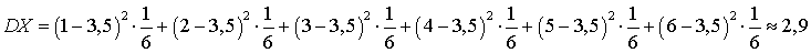 .Пример 27.2Найти дисперсию случайной величины — числа выпавших очков при подбрасывании игрального кубика.В 25 кванте нами был получен закон распределения заданной случайной величины (вероятности каждого из возможных значений 1, 2, 3, 4, 5, 6 равны 1/6), а в 26 кванте — математическое ожидание (MX = 3,5). По определению дисперсии вычисляем: