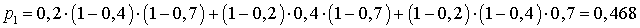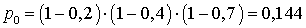 . Пример 28.4Имеется три независимо работающих устройства. Вероятность того, что устройство выйдет из строя за некоторый промежуток времени, равна 0,2, 0,4 и 0,7 для 1, 2 и 3 устройств, соответственно. Найти закон распределения, математическое ожидание и дисперсию случайной величины — числа вышедших из строя устройств.Случайная величина может принимать значения 0, 1, 2 и 3. Вероятность того, что все три независимых устройства выйдут из строя, равна